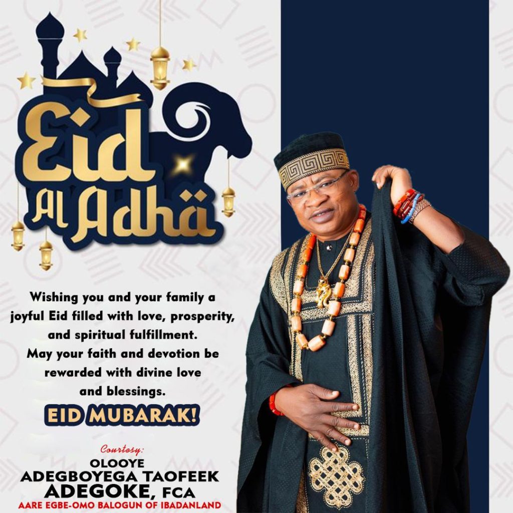 As Muslims across the globe celebrate Eid El-Kabir, Aare Egbe Omo Balogun of Ibadanland and Gubernatorial Aspirant of the Peoples Democratic Party (PDP) Oyo State, Oloye Adegboyega Taofeek Adegoke, has extended heartfelt greetings to the Muslim faithful while urging continued prayers for peace, unity, and prosperity in Oyo State and Nigeria at large.