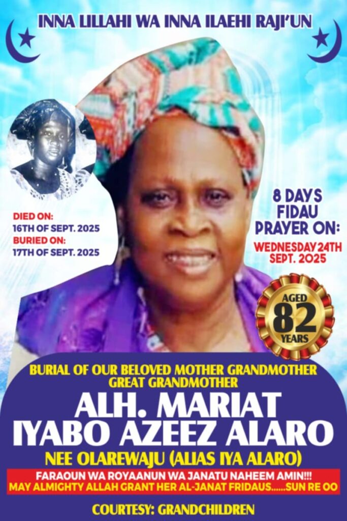 Alhaja Mariat Iyabo Azeez Alaro passed away on September 16, 2025, after a brief illness.