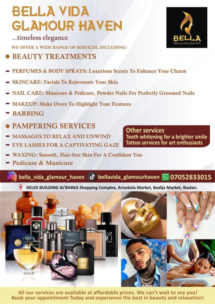 Bella Vida Glamour Haven aims to redefine the concept of beauty and wellness in Ibadan by creating a one-stop destination where clients can access professional services in a serene and customer-friendly environment, and with its central location in Bodija Market and the array of services on offer, the new establishment is poised to become a hotspot for those who desire he best beauty treatments and self-care in Ibadan.