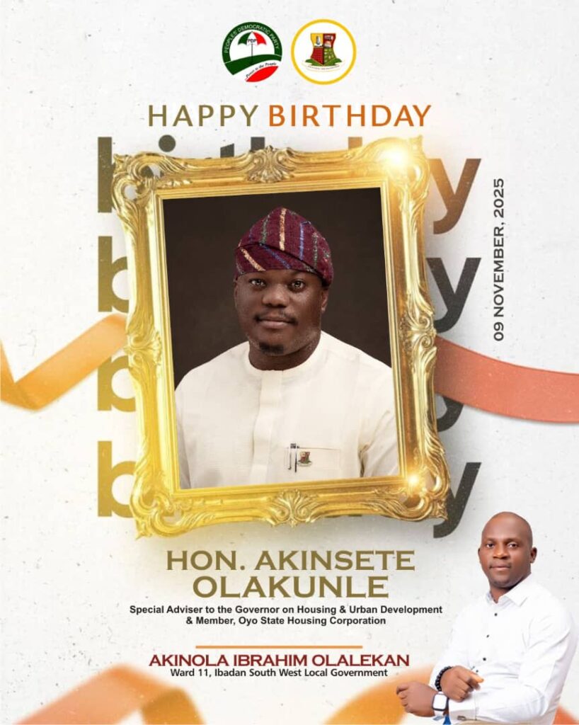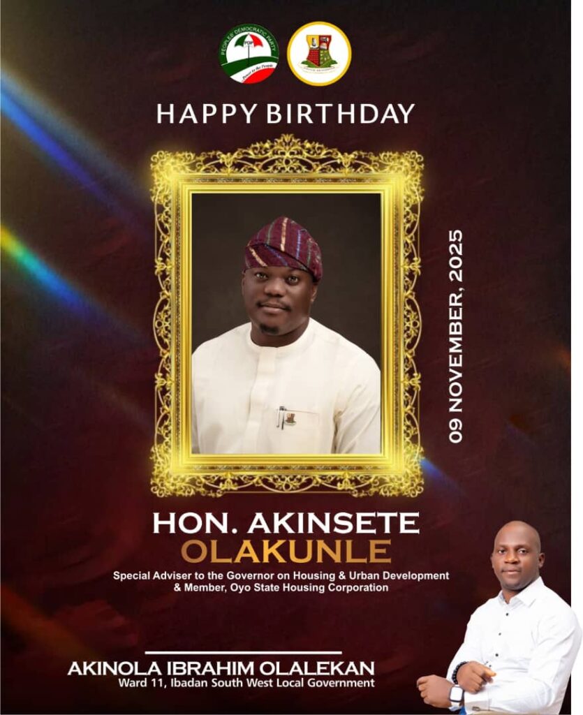 The Special Adviser to the Oyo State Governor on Housing and Urban Development and a distinguished Board Member of the Oyo State Housing Corporation, Hon. Akinsete Olakunle, has been warmly celebrated on the occasion of his birthday by Hon. Akinola Ibrahim Olalekan from Ward 11, Ibadan Southwest Local Government.