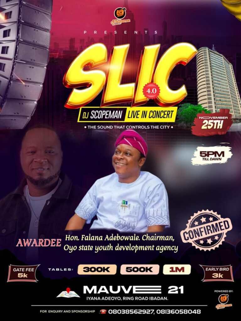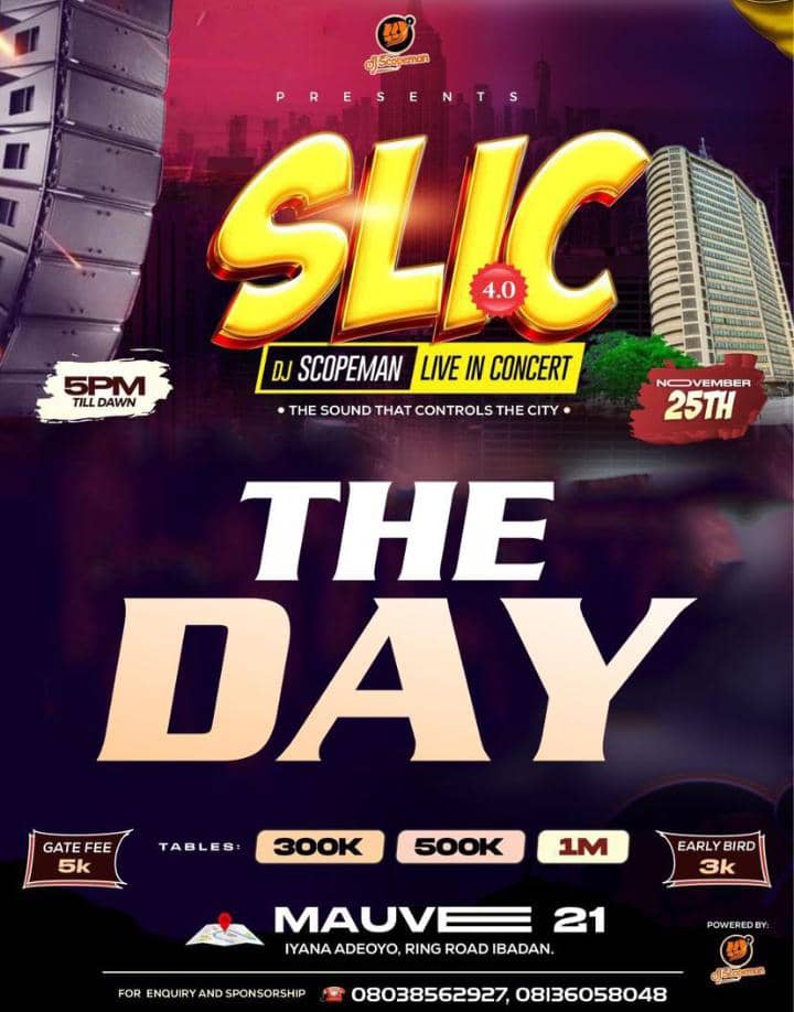 Ibadan is hours away from experiencing the most explosive nightlife spectacle of the year as the highly anticipated SLIC 4.0 Concert powered by DJ Scopeman takes full command of the city tonight at Mauve 21.