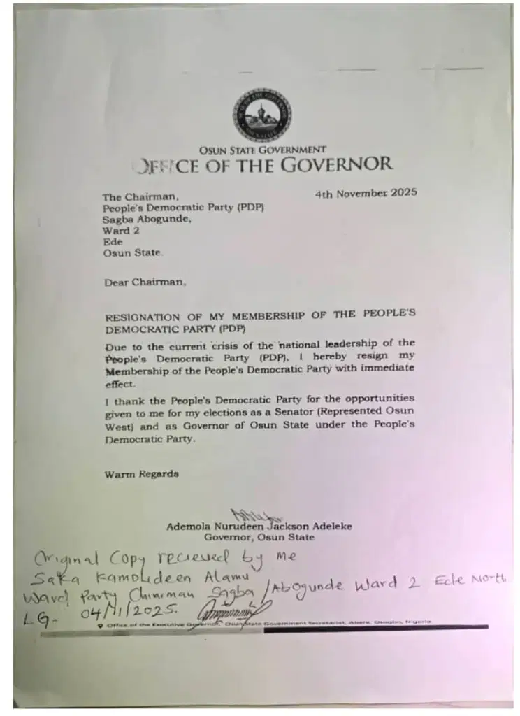 Meanwhile, the Governor in a letter dated November 4, 2025 which surfaced on Monday evening resigned his membership from the party.